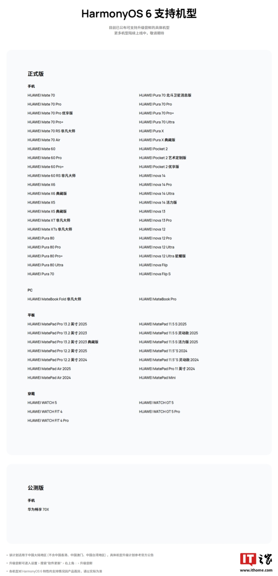 IT之家 2 月 1 日讯息,花粉 Beta 尝鲜约半月后,华为官网显露,华为畅享 70X 手机现进展迎来鸿蒙HarmonyOS 6 系统公测。