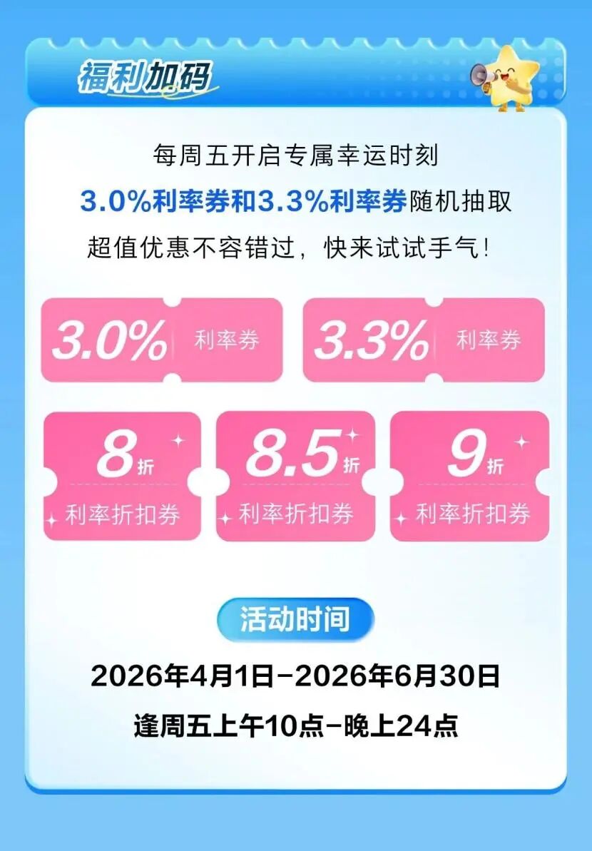 该行于4月3日发布的音书炫耀,即日起至6月30日,其“金米指尖贷”将在每周三08:30限量派送100张利率优惠券。该居品接济线上秒批秒贷,额度最高30万元,期限最长达3年,1年内可先息后本还款,使用利率券后年化利率低至3%,与一季度的动作比拟下调了2BP。