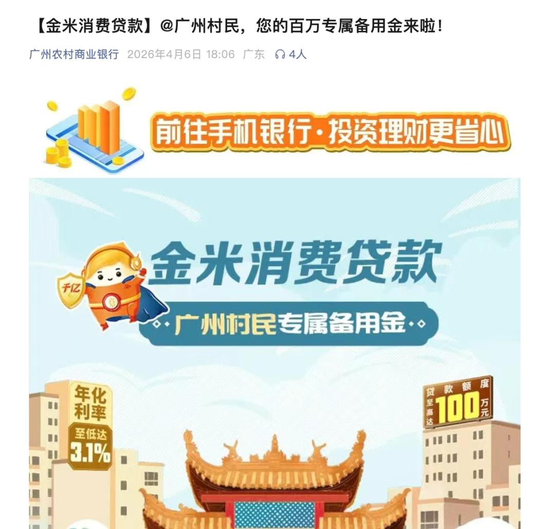 4月6日,广州农商银行发布音书称,该行推出广州村民专属消费贷款居品“金米消费贷款”,即日起至6月30日,专享利率最低达3.1%,额度最高达100万元,期限最长达5年,还款形势涵盖等额本息、搀杂还款、按月还息按缱绻还本及先息后本等多种类型。