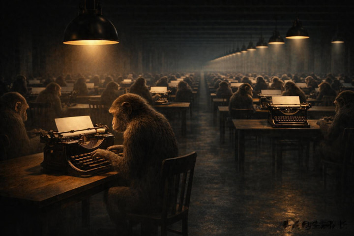 给无尽多只山公、无尽长的技能、无尽多台打字机,它们大意敲打,表面上总有一天能敲出莎士比亚全集。