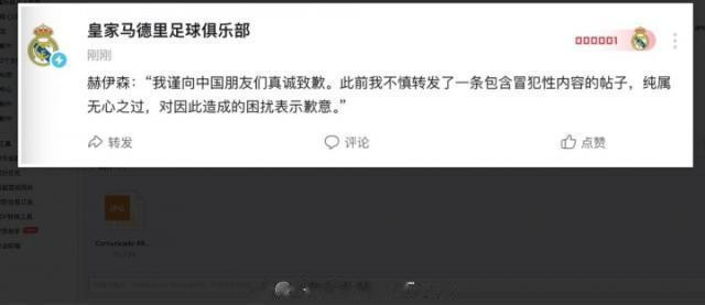博主“IGotCroatianFever”微博晒图,收到了皇马对于赫伊森辱华事件的回应,称球员已通过中国社媒进行了谈歉。皇马回应邮件本色:尊敬的先生/女士:对于您的邮件,咱们在此见告,球员已按照随附新闻稿中的表述,在中国卤莽媒体上致歉:“我为巧合均共享了冒犯华东谈主社区的帖子而谈歉。这是一次无心之失,并无任何坏心。”