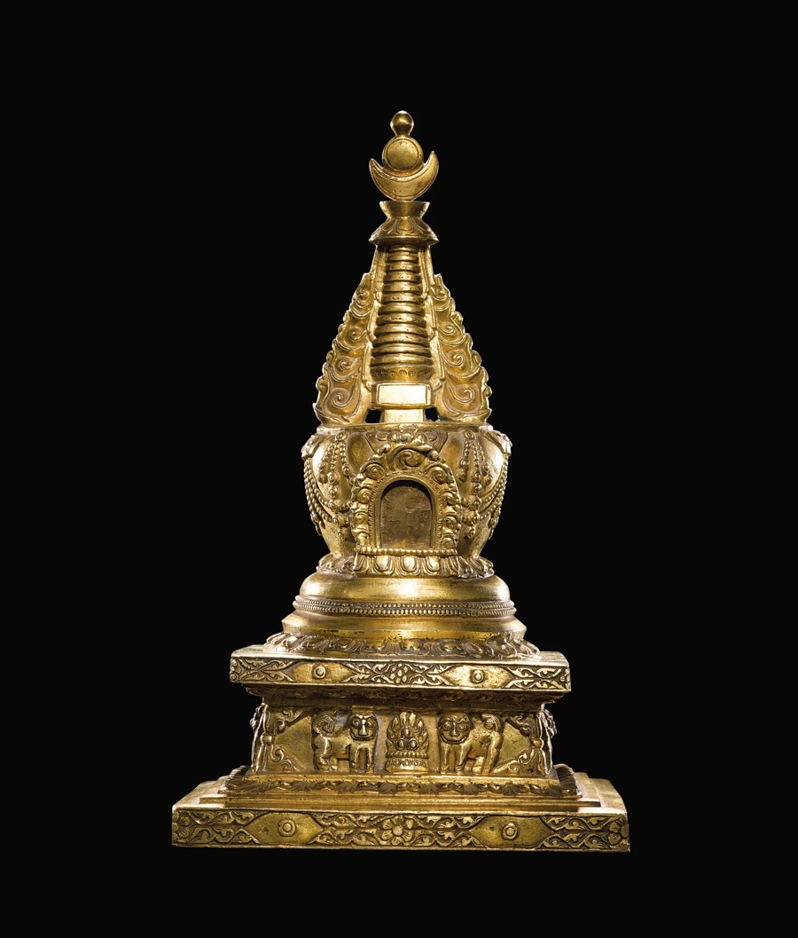 青铜鎏金佛塔为清朝时间锻造的释教文物,高约2米,接受青铜鎏金工艺制作。