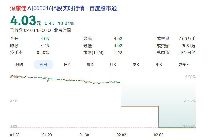2月3日,深康佳A大跌10%,平直来了个一字马。