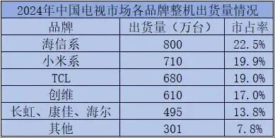 2024年中国电视市集,海信、小米、TCL、创维当作四大主力出货色牌,康佳退居第二梯队。