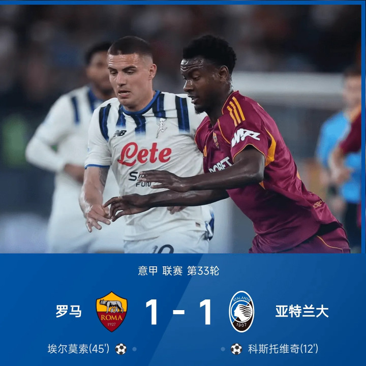 开场后亚特兰大发轫轻松僵局。第12分钟,德容恩右路直塞,科斯托维奇弧顶洒脱全国波破门。而后罗马揣测发动攻势。苏莱大禁区前远射被亚特兰大门飞身扑出。马伦两次禁区绝佳契机射门均被亚特兰大门将神扑救主。补时阶段,罗马右路传中,伦施后点头球摆渡,埃尔莫索门前凌空抽射破门,罗马扳平比分。