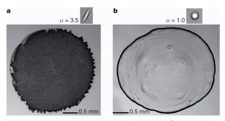 其中一个很有代表性的使命来自Yunker等东谈主在2011年发表的Nature论文。筹商发现,要是把悬浮颗粒从球形换成椭球形,咖啡环效应不错被彰着扼制。