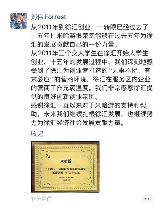 幸运彩app官方下载 米哈游刘伟一又友圈晒图:“十四五”累计创税150亿元