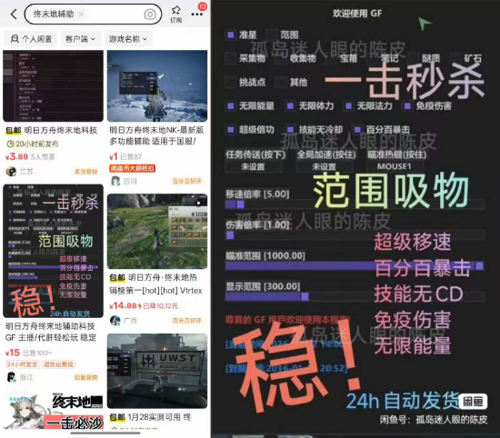 有外挂商家向《BUG》栏目知道,此类外挂主要适用于《明日方舟:临了地》PC端,中枢功能包括透视宝箱、无穷冲刺、伤害翻倍、舆图传送等,能大幅镌汰游戏难度。当被问及使用风险时,商乡信誓旦旦愉快“现在为止0封,无须惦念账号被封情况”,以致暗示可提供售后指令,确保外挂贯通启动。