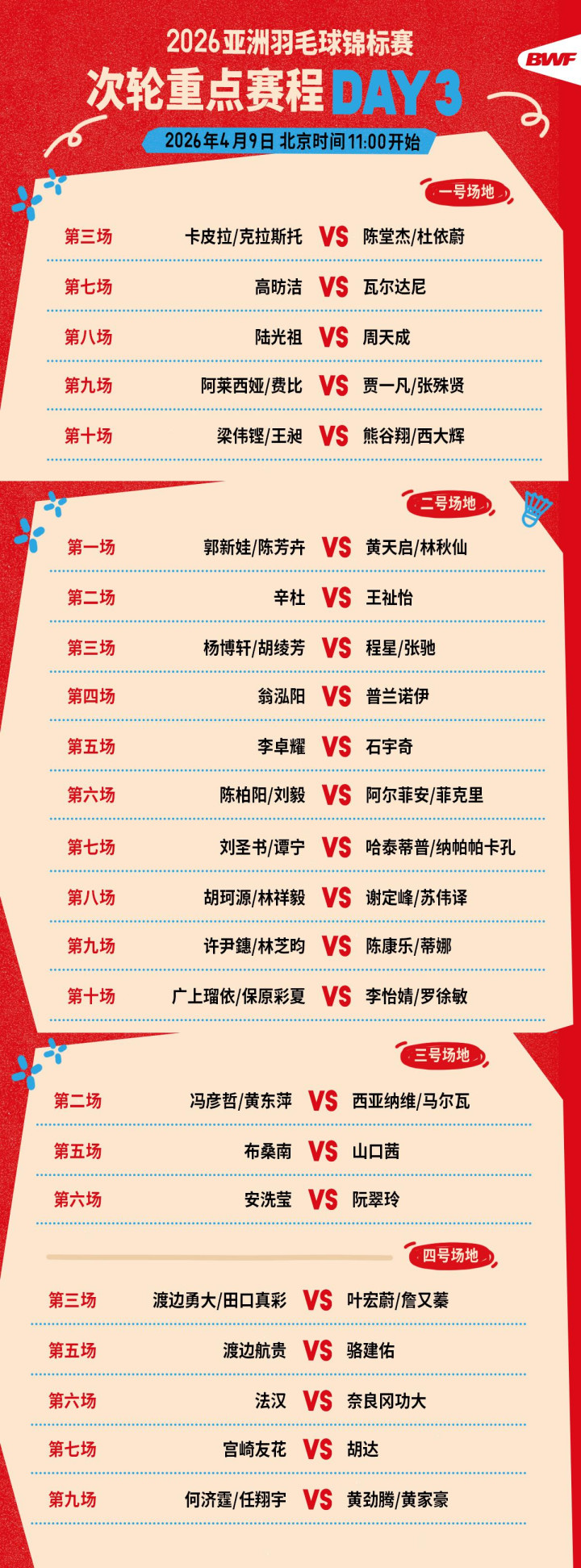 2026年亚洲羽毛球锦标赛今天(9日)迎来第三个比赛日,澳门十大娱乐平台幸运彩将于北京时分中午11时开赛。